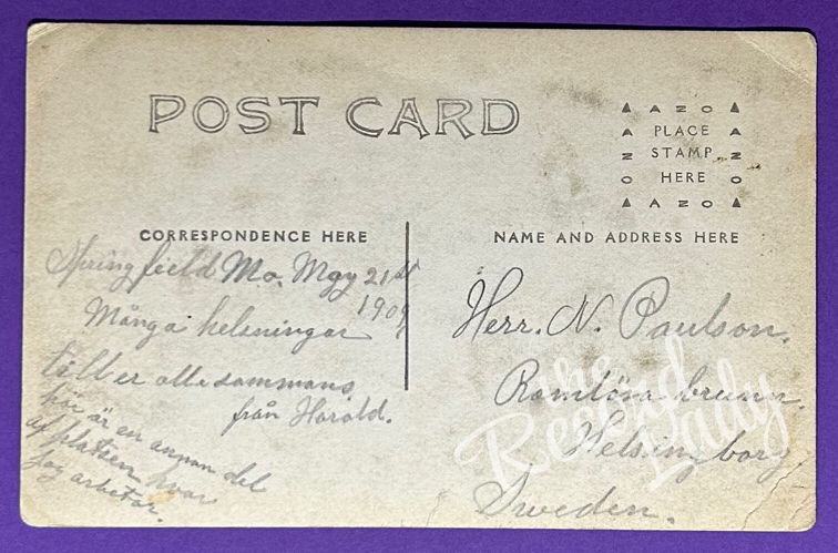 Three postcards were in the personal effects of Harold B. Paulson. One card he intended to send to send to N. Paulson at Ramlosa Brunn, Sweden. The card was not sent. It is dated 20 May 1909. It shows the Frisco plant, Springfield, Mo. under construction. In Swedish, Harold, said he was working at the plant. History of the plant shows it opened on 5 July 1909 as described on the panoramic view. This suggests that since Harold wrote of work there before its opening, he likely was engaged in the construction of the plant.