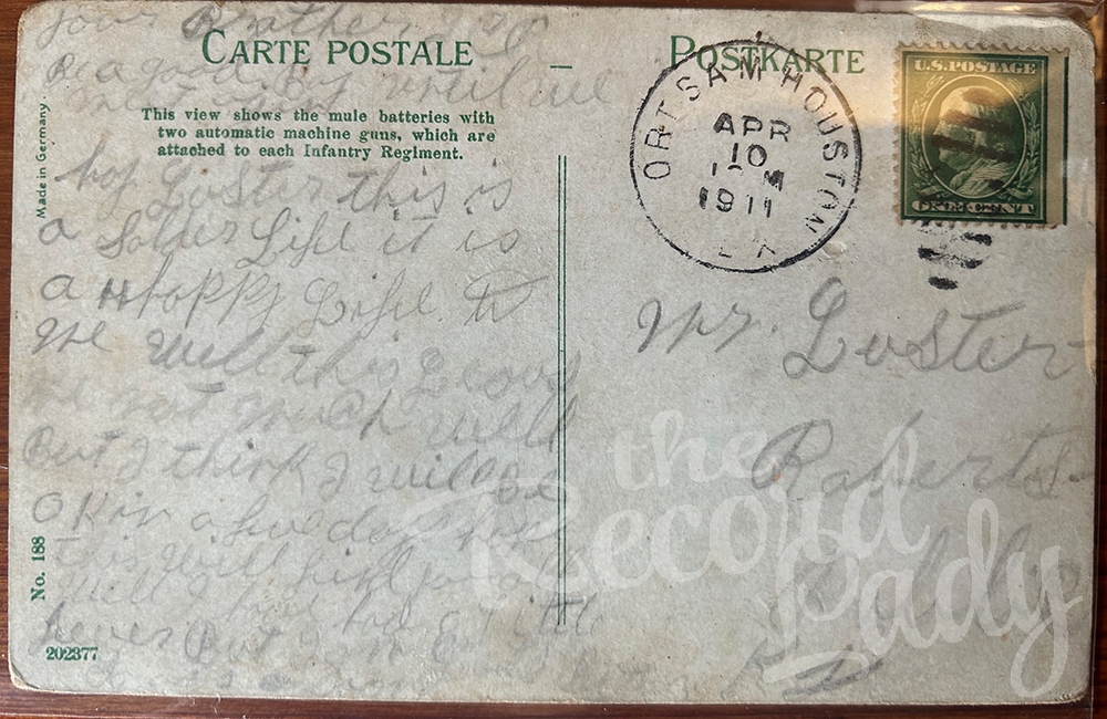 On 25 March 1911 John C. Roberts, Luster’s brother, enlisted in the U.S. Army.1 He sent Luster a postcard extolling the good life in the military,
