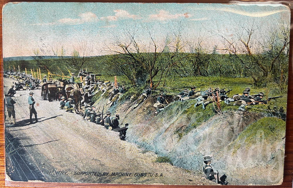 FRONT and BACK: “Infantry Supported by Machine Guns U.S.A.” postcard from J. C. R. (John C. Roberts) to Mr. Luster Roberts, in the author’s collection, from grandmother’s photograph collection.