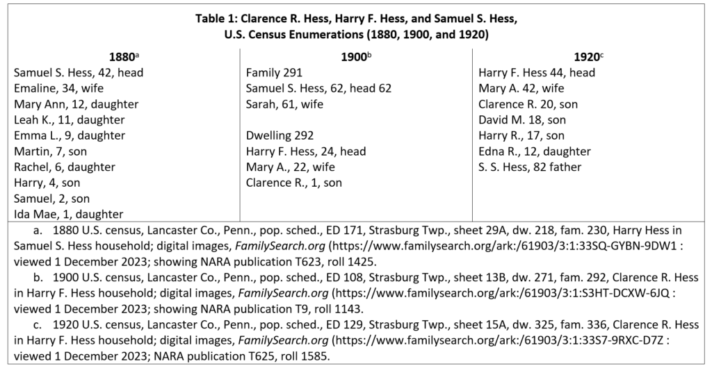 3. Find A Grave, https://findagrave.com/, memorial 31291101, image of Clarence R. Hess gravestone (Strasburg Cem., Strasburg, Lancaster Co., Penn.) by “Carolyn Y Lowe Shifflett,” 11 November 2008. “Clarence R. Hess, Strasburg R1, Dies,” Lancaster New Era (Penn.), 1 February 1982, p. 2, col. 3; digital images, Newspapers.com (https://www.newspapers.com/image/562347282/ : viewed 1 December 2023).
