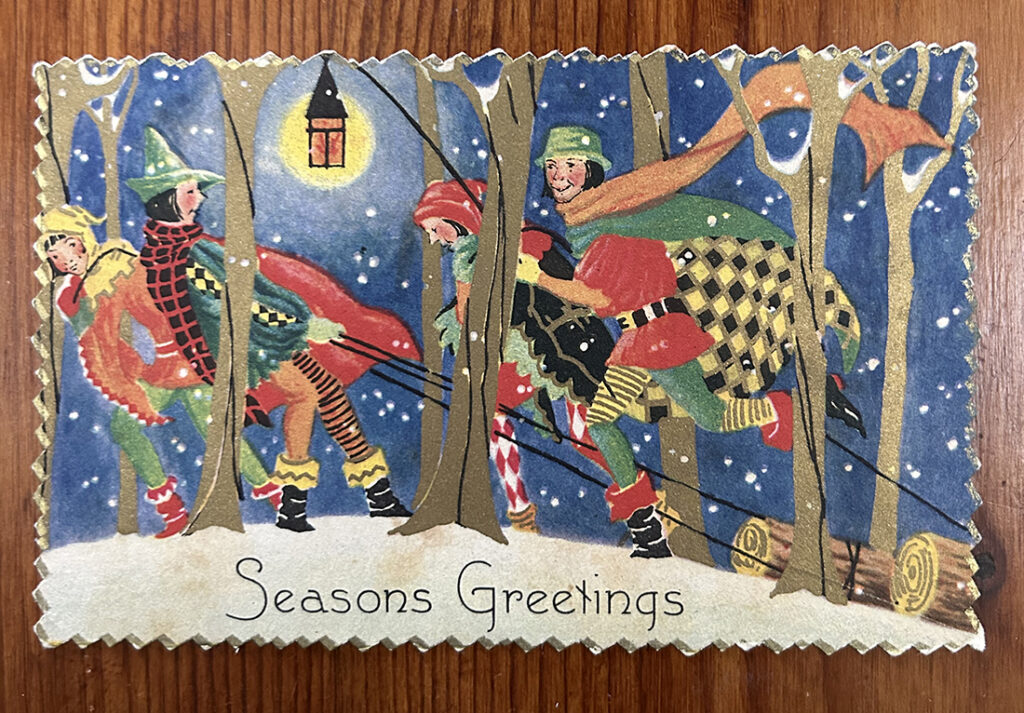 This adorable winter holiday postcard is from the author’s personal collection (see Figure 1). There is no manufacturer’s mark or name on the card. There are no stamps or postal franking (see Figure 2). The illustration is in the style that was popular in the first half of the twentieth century. The subject of jugglers (or jesters) dressed in red and a yule log appeared in cards from about 1910 and is associated with medievaling (harkening to “olden times”) in the the modern era.1 Medievalized designs included gold accents, similar to medieval manuscripts (see Figure 3).2