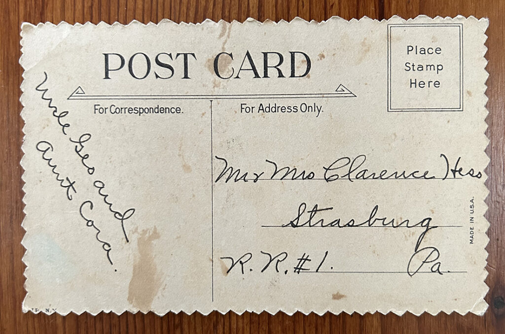 The card is addressed to Mr. and Mrs. Clarence Hess in Strasburg, Pennsylvania. They lived on RR #1. The senders were Uncle George and Aunt Cora.