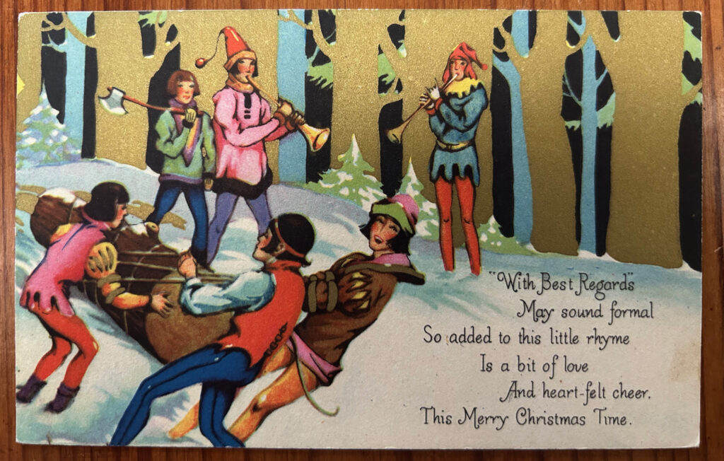 The subject of jester-like men bringing in a yule log can be found on other post cards. Wikimedia Commons (https://commons.wikimedia.org), “Yule and New Year Postcard With Two Jester-Like People Pulling Yule Log Through Snow, and A Third Carrying Holly Leaves, With “The Season’s Best Wishes- May Yuletide Joys Be Ever Thine, Thy holidays Most Merry, Thy New Year -,” 17:48, 17 August 2017 (image posted).