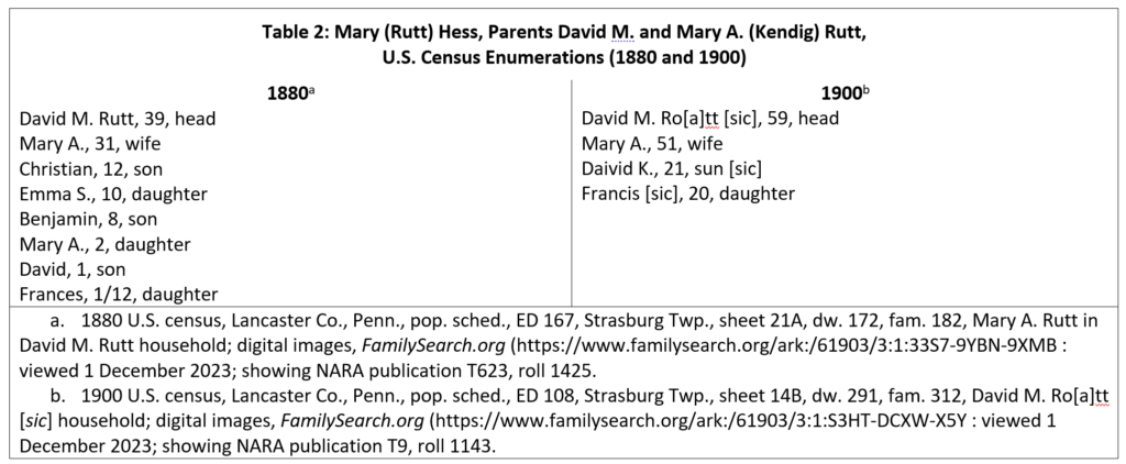 Clarence’s mother was Mary Ann (Rutt) Hess, daughter of David M. and Mary A. (Kendig) Rutt.6. Gertrude had no known siblings named George or Cora (see Table 2).