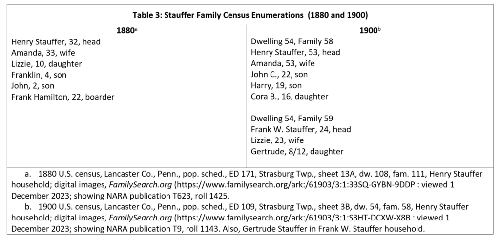 Uncle George and Aunt Cora were most likely Gertrude’s Uncle and Aunt rather than Clarence’s. Gertrude’s father was Franklin “Frank” Stauffer, son of Henry Strauffer (see Table 3). Cora B. (Stauffer) was Franklin’s sister. Cora married George Lefever on 8 March 1904 in Lancaster County.7 George died in 1959 and Cora was the informant on the death record.8