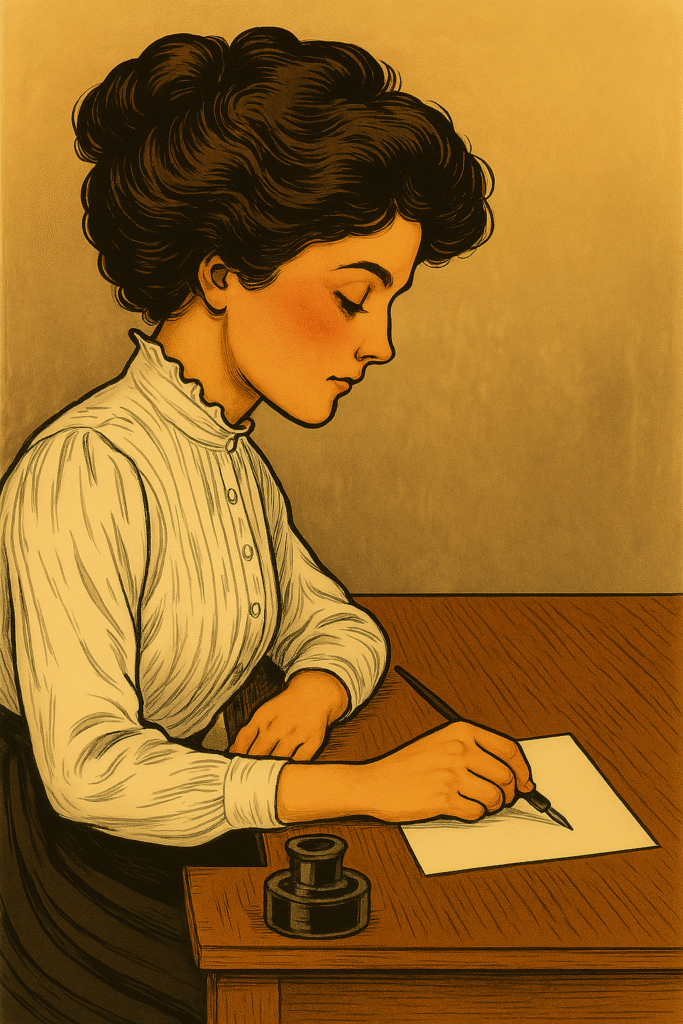 Illustration: Microsoft Copilot (Bing AI), Woman Writing at Desk Wearing Early 1900s Dress, 30 June 2025, 8:35 PM.